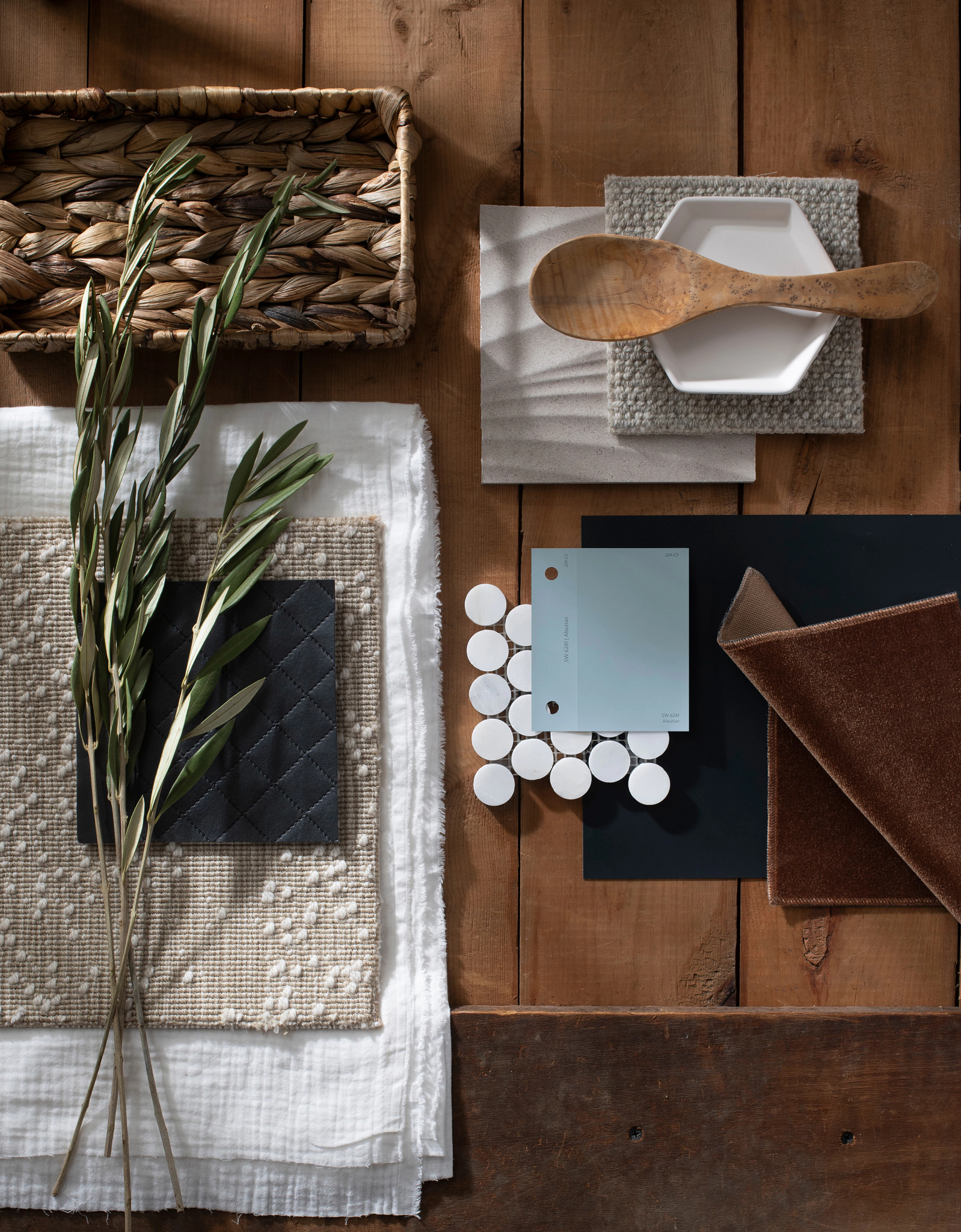 \los tonos de madera blanqueados por el sol y una colección restringida de colores a combinar